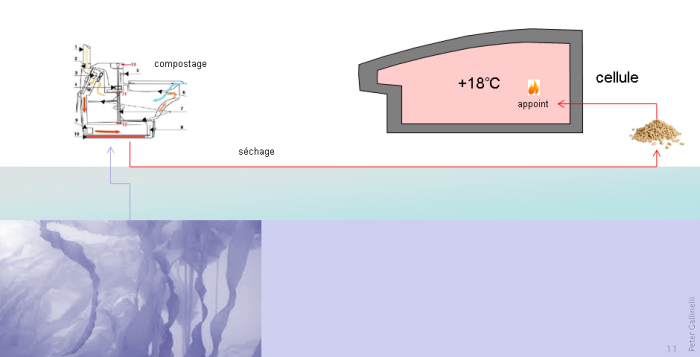 Des matières biodégradables sont traitées par une unité de microcompostage, éventuellement séchés et comprimés. Un tel système présente aussi l'énorme avantage de définitivement résoudre la question des effluents et l'ensemble des matières biodégradables dans des situations stationnaires à long terme.