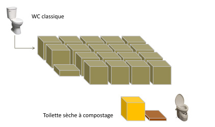 Toilettes : à compostage, soit une production inférieure à 100kg de compost neutre et 1000 litres d’urines pour 10 mois d’autonomie (2.5 personnes en moyenne), contre 18500 litres d’eau noire, soit 18 x moins de masse et de volume.