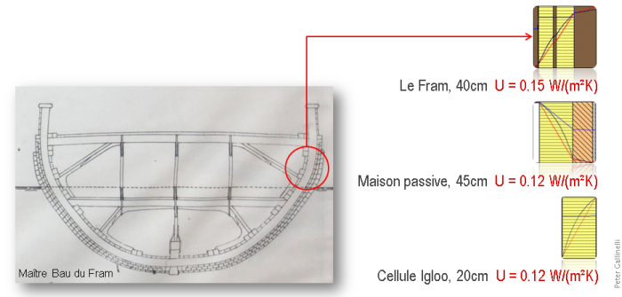 Le Fram a été conçu et construit selon les meilleures techniques disponibles au milieu du 18ème siècle. Aujourd'hui, le Fram est reconnu comme la première 'maison' passive. Le passive igloo veut rappeler que le recours à des énergies conventionnelles n'est pas une fatalité: depuis la banquise, Nansen rapporte que le poêle du bord s'avère inutile au point de considérer son débarquement ... grâce à l'efficacité de l'isolation thermique.
