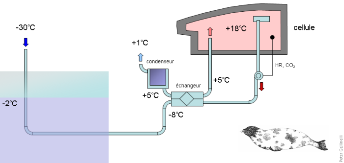L'air neuf (pouvant descendre en-dessous de -30°C) bénéficie d'un préchauffage par l'eau de mer (-2°C), avant de passer par un échangeur. La chaleur contenue dans l'air extrait est partiellement valorisée pour le préchauffage de l'air frais, le solde est utilisé pour la production d'eau potable par condensation et fonte de glace.