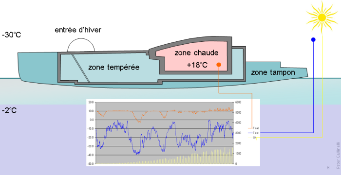 Une excellente isolation thermique réduit les pertes de chaleur à néant. Ainsi, par le seul dégagement de chaleur des occupants (métabolisme, activités), l'habitacle reste naturellement à une température 25°C supérieure à l'extérieur.