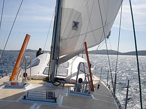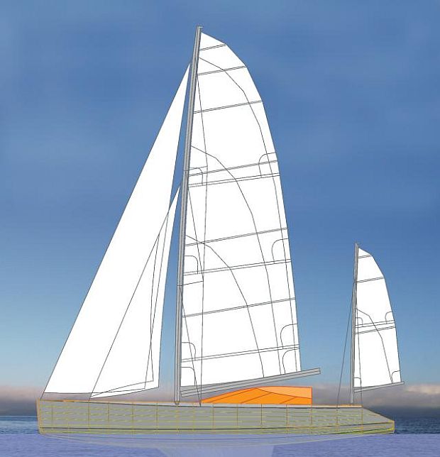 La propulsion sous voiles est assurée par un gréement autoporteur 9/10 avec grand-voile "full-batten". Cette solution ainsi qu'un accastillage de qualité et bien dimensionné autorise la navigation en équipage réduit, voir en solitaire. Dans le petit temps un genacker ou spi asymétrique doublent la surface de voilure. Toutes les manœuvres sont renvoyées au cockpit y compris les prises de ris de GV. Un artimon, ou 'tape-cul', permet d'améliorer l'équilibre sous trinquette seule, dans le très gros temps ou au mouillage où cet espar prend la fonction de bossoir.