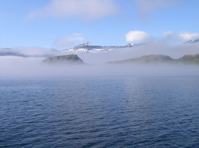 maintenant, l'eau du fjord est lisse comme un mirroir et autour