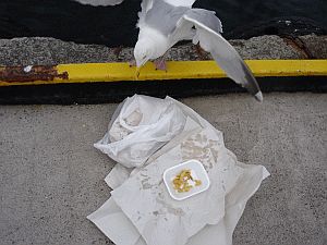 Cependant, le lendemain matin nous fait le cadeau d'un soleil radieux, vent mollissant, les conditions idéales pour explorer les environs et les îles par la voie terrestre en attendant la marée pour continuer notre route vers Fair Isle, ilôt à mi-chemin entre les Shetland et les Orkney. Avant de quitter Lerwick, nous nous faisons appater par l'odeur d'un 'Fish and Chips', plat culte qui sans doûte tire sa réputation de son absence complet d'intérêt culinaire. Afin de prévenir des troubles digestifs, nous complétons le repas par un coca - indispensable! Ce repas autochtone sera consommé sur les quais du port - un poisson agonisant brasse à la surface de l'eau alors que les goélands semblent s'intéresser à notre repas: nous le partagerons généreusement.
