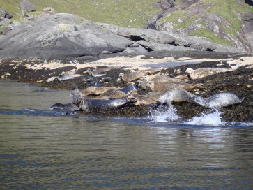 une colonie de phoques, certains assoupis sur les rochers vont interrompre